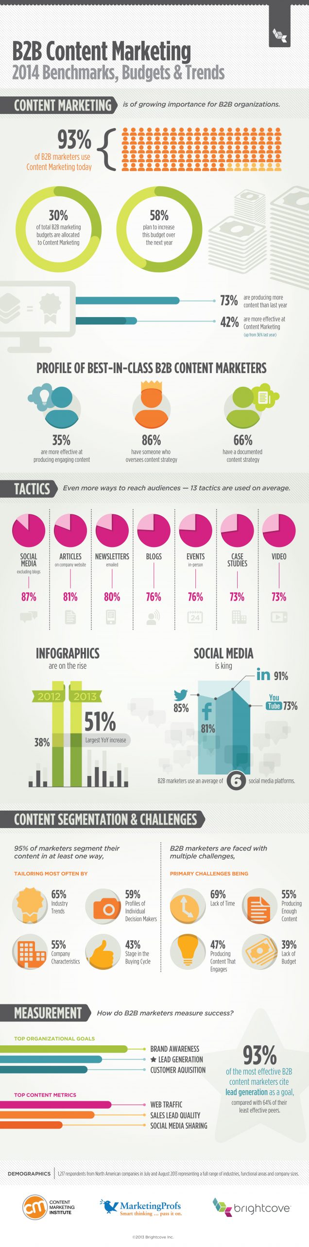 Infographic – Top Content Marketing Trends You Need To KnowNov 6th, 2013 · 0 CommentInfographic – Top Content Marketing Trends You Need To Know This infographic from the Content Marketing Institute shows how important it is to include content marketing as part of your marketing plans.The Key To Creating Successful Content Marketing35% of B2B leaders say their key is to create engaging content 86% of companies hire someone to manage their content marketing 66% swear by a specific strategy Top 7 Ways Companies Are Engaging Their AudiencesSocial media – 87% Articles specifically posted on their company website – 81% E-newsletters – 80% Blogs – 76% Live events – 76% Case studies – 73% Videos – 73% How important is content marketing as part of your business’ …